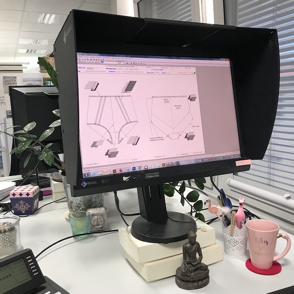 Während der gesamten Zeit sammeln wir Informationen und Bilder und erstellen daraus ein so genanntes Moodboard. Parallel dazu fertige ich Zeichnungen an, mit der Hand oder mit dem Mousepad. Die ersten, konkreten Artikelentwürfe gehen dann an die Kollegen aus dem Produktmanagement. Mit den Produktmanagern wird besprochen, ob die Entwürfe gefallen und in das SCHIESSER Konzept passen. Dann lege ich die Stoffe und Details, wie in etwa Knopfleisten oder Bundvarianten, fest.